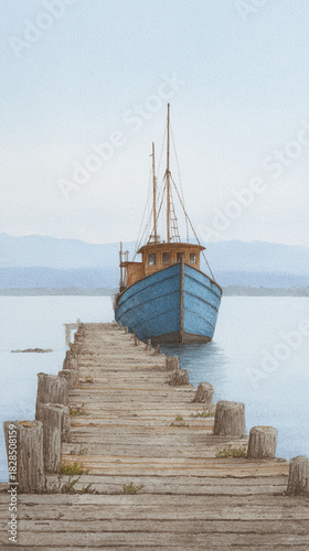 Fototapeta premium Explore the Tranquil Beauty of a Blue Boat Docked on a Rustic Pier Surrounded by Serene Waters and Vast Skies in a Stunning Seascape