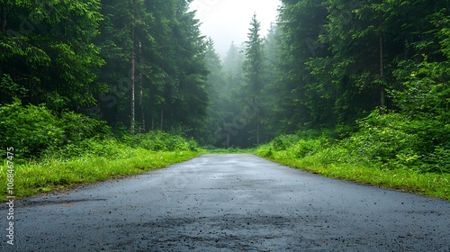 Fototapeta premium Explore the tranquil beauty of a misty road surrounded by lush green forests