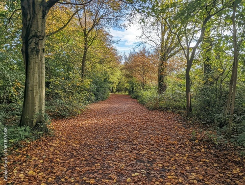 Obraz premium Explore the tranquil warm autumn path blanketed in colorful fallen leaves...