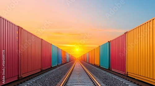 Fototapeta premium Explore the vibrant sunrise over a train yard filled with colorful shipping...