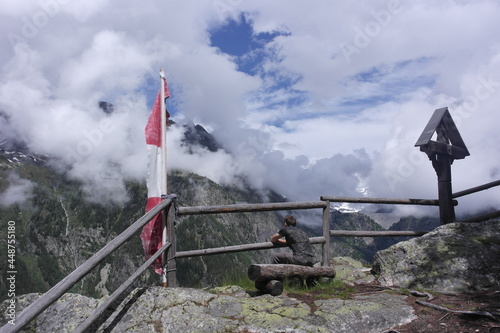 Fototapeta premium explorer of mountain alpine beauty at the level of the clouds, fresh air...