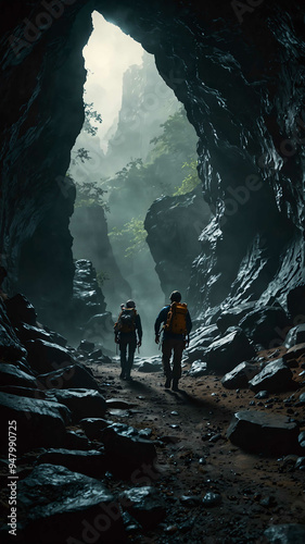 © sevenSkies, Obraz premium explorers navigating a mysterious deep nature cave background backdrop