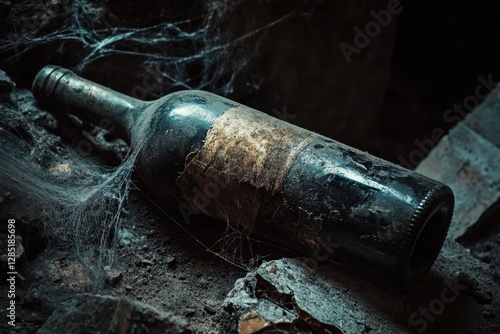 © Thanapong, Obraz premium Exploring a dusty old wine bottle lying on its side in an abandoned cellar capturing the essence of forgotten treasures gritty environment macro photography rustic charm