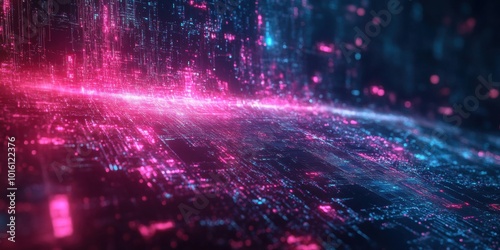 Obraz premium Exploring a Futuristic Technology Landscape with Neon Lights and Data...