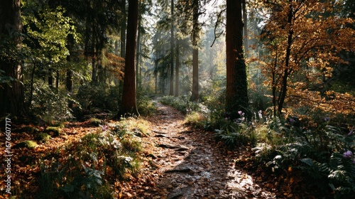 Fototapeta premium Exploring a serene forest path tranquil woodland nature photography autumn...