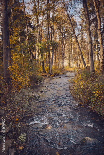 © Irina Magrelo, Obraz premium Exploring a serene forest trail with a creek in autumn during golden hour
