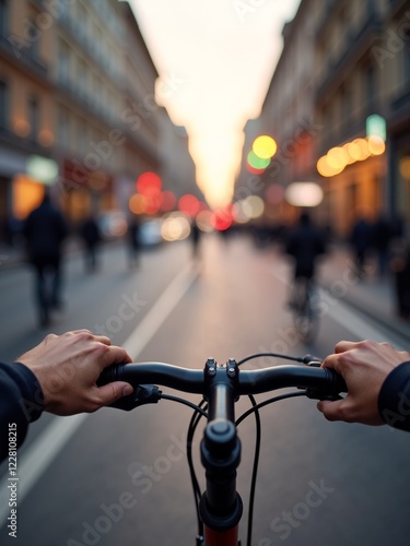 Naklejka premium Exploring a vibrant city street at dusk while riding a bicycle with a clear...