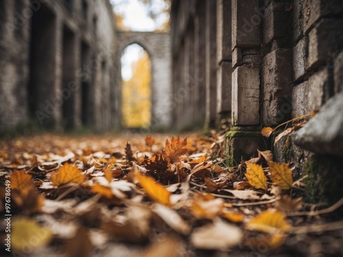 Obraz premium Exploring abandoned ruins with autumn foliage in a decaying urban landscape.
