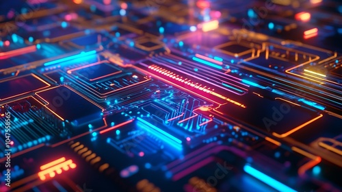 Obraz premium Exploring Abstract Electronic Circuits in a Vibrant Neon-Lit Image...