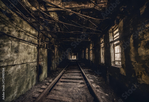 Naklejka premium Exploring an old abandoned coal or mineral mine. Dark and dim shaft. old...