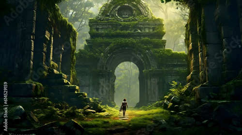 Obraz premium Exploring Ancient Ruins, A lone adventurer with a torch stands at the entrance of a crumbling stone temple, overgrown with vines and moss