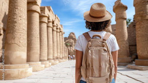 Fototapeta premium Exploring ancient ruins, traveler admires historical columns under blue sky