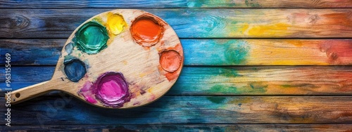 Fototapeta premium Exploring Artistic Creativity: A Vibrant Palette on Rustic Wood