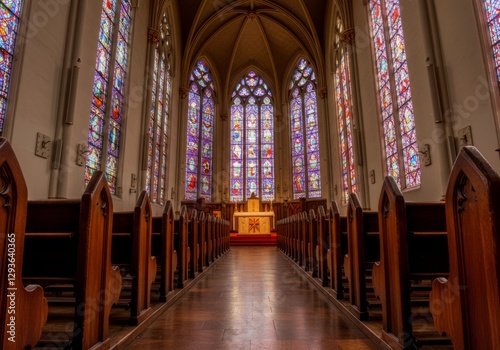 © Ziyasier, Fototapeta premium Exploring Grand Church Interior with Stained Glass Windows and Wooden Pews