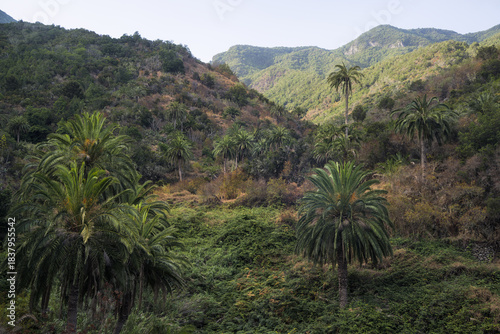 © peresanz, Fototapeta premium Exploring Lush Palm Valleys in La Gomera, Spain on a Tranquil Morning