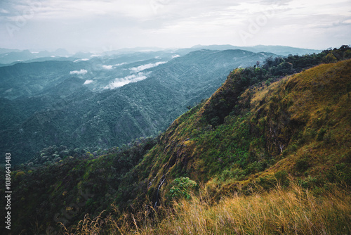 Fototapeta premium Exploring majestic mountain range lush greenery landscape photography cloudy...
