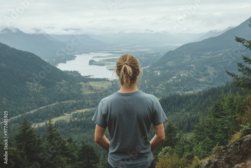 © Glce, Naklejka premium Exploring Nature - Hiker Stands On Top of Mountain looking out