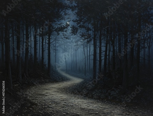 © Kanisorn, Fototapeta premium Exploring shadowy forest trails, uncovering the mysterious and inviting paths meandering through dense, dark woods.