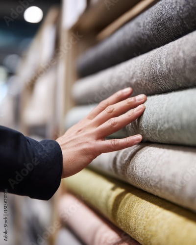 © Anna, Obraz premium Exploring texture and quality of fabrics in a textile store,National Sewing Month