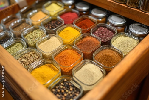© Thanapong, Naklejka premium Exploring the aromatic world of spices a detailed look at a vibrant spice drawer filled with varieties kitchen photography warm colors perspective culinary concept