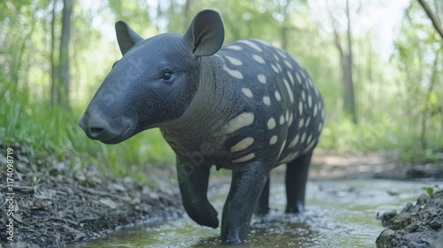 Fototapeta premium Exploring the dense tropical rainforest, a Malayan tapir approaches a water body