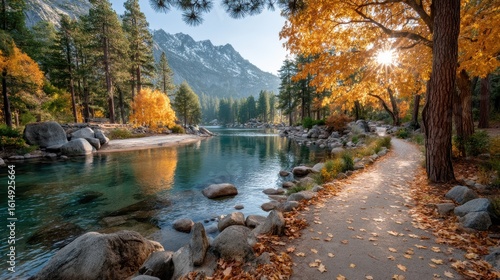 Obraz premium Exploring the Serene River Pathway Framed by Vibrant Fall Foliage and...