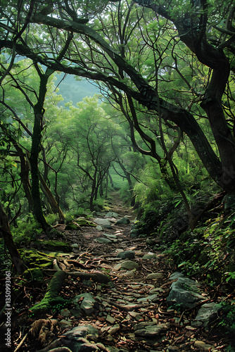 Obraz premium Exploring the Serenity: An Enchanting Journey through Woodland Hiking Trails and Mountain Ranges