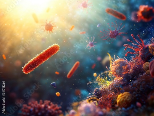 © Tetiana, Naklejka premium Exploring the vibrant microscopic world filled with colorful microorganisms and hidden life forms in sunlight. Generative AI