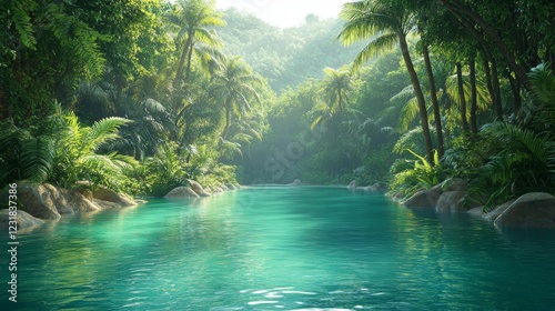 © aukkasit, Naklejka premium Exploring tranquil river serenity amidst lush tropical forest nature photography landscape