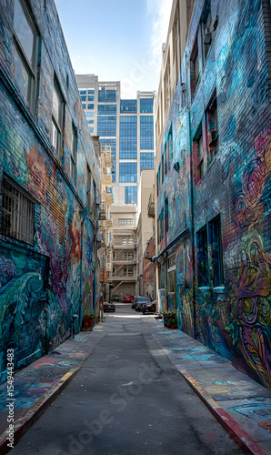 © Lucianastudio, Fototapeta premium Exploring urban art in an alleyway showcasing colorful murals and architecture under a clear sky view