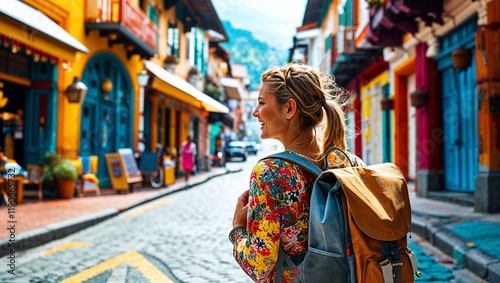 © Robbie Smith 1 , Obraz premium Exploring vibrant street, woman with backpack enjoys scenery