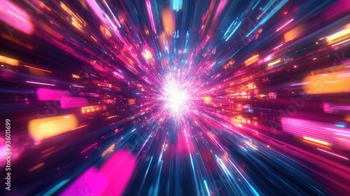 © arthit, Naklejka premium Explosion colorful rays. Shine dynamic scene. Magic moving fast lines. Hologram display. Bright blurred waves. Stylish space bright fantasy abstract background. Future tech. 3D illustration.