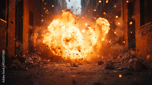 © Ahsan, Fototapeta premium Explosion fire bomb blast destruction war danger cityscape building debris rubble urban scene effect danger