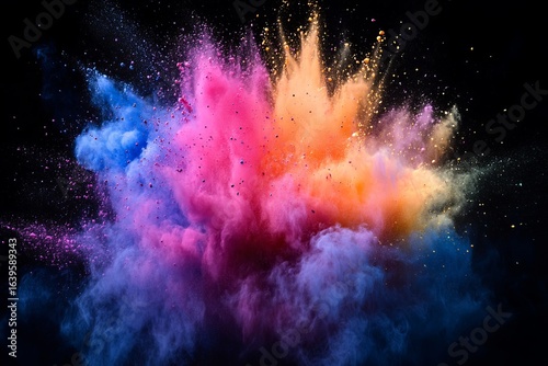 Fototapeta premium Explosion of colorful powder in motion with blue, pink, and orange hues against black background