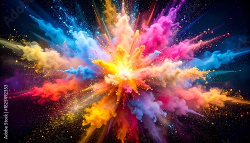 Obraz premium Explosion of vibrant colored powder erupts from center against a dark, cosmic...