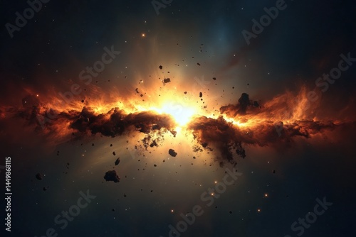 Fototapeta premium Explosive cosmic rift with glowing orange light and asteroid debris