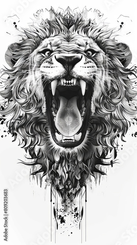 © Tida, Obraz premium Explosive ink-style lion roaring art - This artwork depicts a roaring lion with an explosive ink-splatter style, creating a raw and powerful energy
