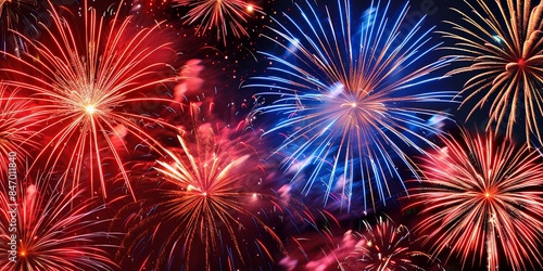Naklejka premium Explosive Red and Blue Fireworks Display Night Sky
