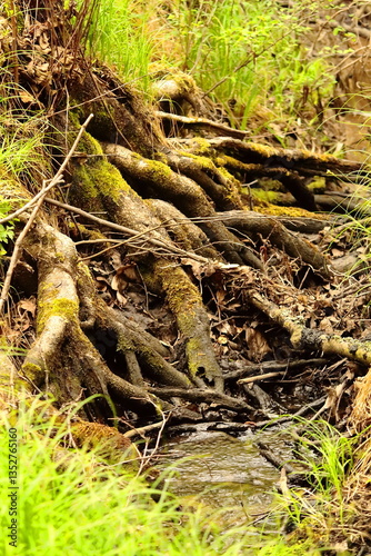 © Maciej Bonk, Fototapeta premium Exposed Tree Roots by Stream in Lush Forest Surroundings