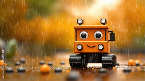 © Paisan, Fototapeta premium Expressive Animatronic Robot Concept. Happy Orange Toy Truck Smiling in Rain with Colorful Background of Autumn Leaves