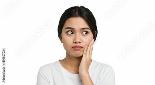© Firman Dasmir, Fototapeta premium Expressive Indonesian woman with a pensive look against a clean white backdrop