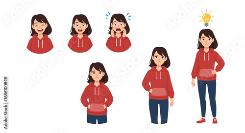 © Sardi, Obraz premium Expressive Woman in Red Hoodie A Collection of Emotions and Ideas