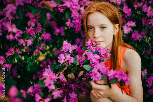 Fototapeta premium Expressive young girl with long red hair and pale skin sniffs flowers in the garden