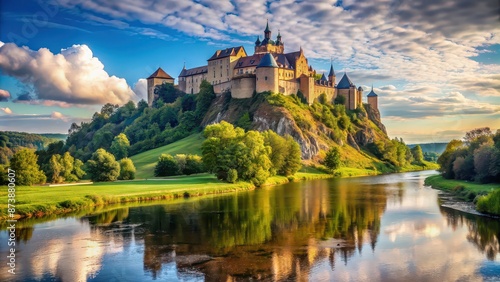 Obraz premium Exquisite ancient castle on high riverbank, castle, ancient, medieval,...