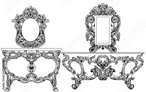 Naklejka premium Exquisite Baroque dressing table engraved. Vector French Luxury rich intricate ornamented structure. Victorian Royal Style decor