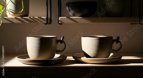 © Aulia, Obraz premium Exquisite Ceramic Coffee Cups Set Against a Backdrop of Muted Tones And Natural Light