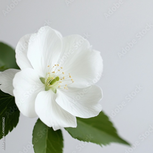 © WisChi, Fototapeta premium Exquisite Close up of a Delicate White Blossom with Green Leaves on a Light Background