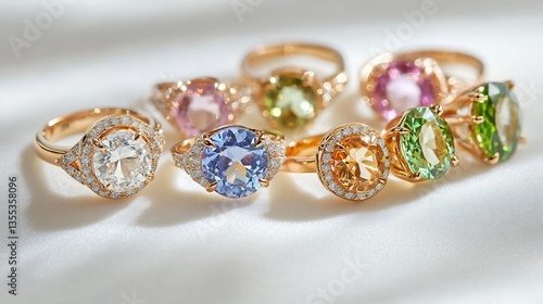 © win, Fototapeta premium Exquisite Collection of Gemstone Rings Displayed on Silky White Fabric