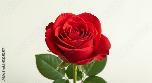 © Rachman, Fototapeta premium Exquisite Deep Red Rose Bloom, Fresh Green Leaves, Soft Lighting on White