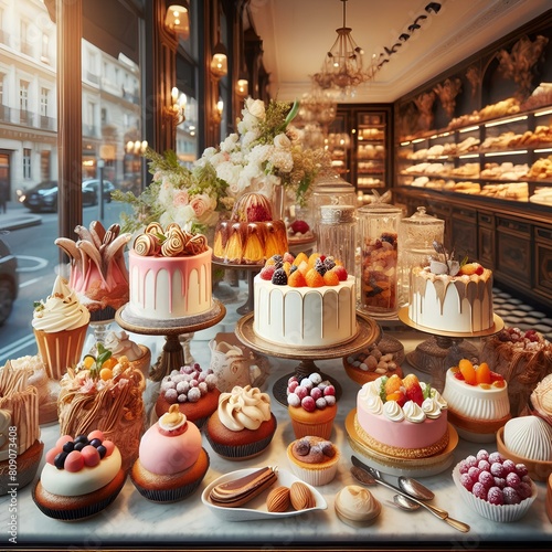 © R-CHUN, Naklejka premium Exquisite french patisserie Showcasing Delectable Desserts in Window Display Pastry Shop.